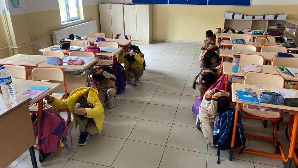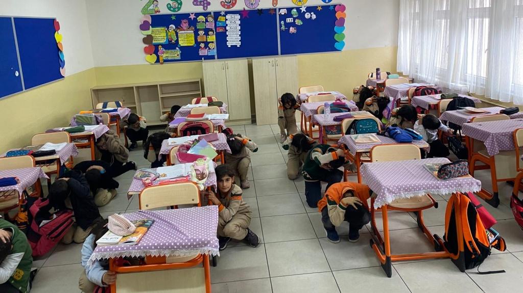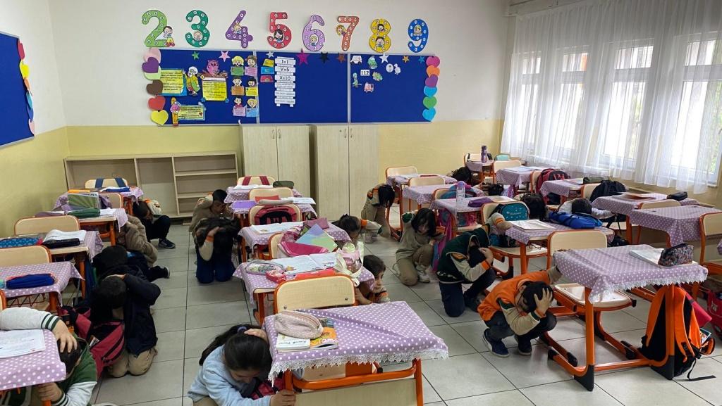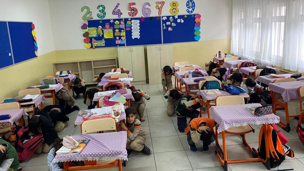 Öğrenci ve öğretmenlerimiz deprem başladığı anda bulundukları yerde olması gerektiği gibi pozisyon aldı. (Çök,Kapan,Tutun) Deprem 45 saniye sürdü ve sonrasında tahliye işlemi başladı. Düdük komutuyla depremin sona erdiği duyuruldu.