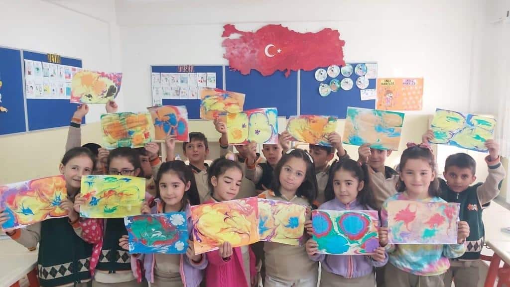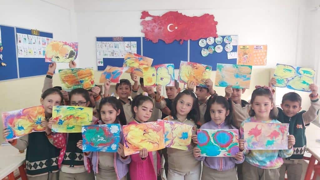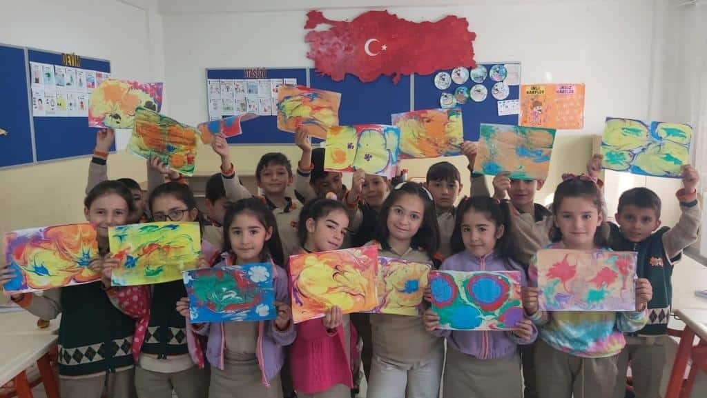 Öğrencilerin okul süreçlerinde moral ve motivasyonunu artırmak, sosyal gelişimlerine destek olmak amacıyla 3/A sınıf öğretmeni Abdullah YERAL, gözetiminde ebru sanatı kâğıt süsleme çalışması gerçekleştirdiler.